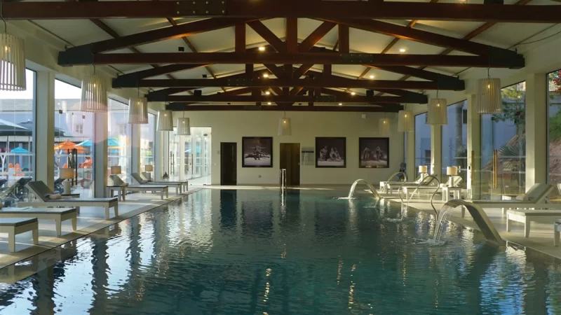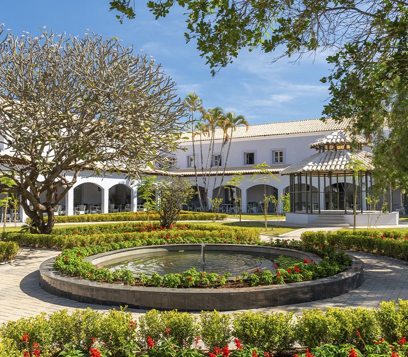 A estrutura de lazer inclui piscinas, spa, academia, áreas verdes, trilhas e espaços de relaxamento. A proposta do hotel é proporcionar bem-estar, descanso e contato com a história local.