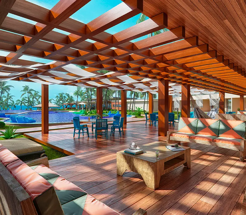 - Além dos quartos e suítes, a Rede Carmel oferece bangalôs exclusivos para uma experiência ainda mais especial.