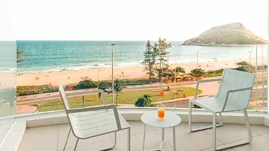 O destaque fica com a luxuosa Suíte Júnior, uma cobertura com cama king size, espreguiçadeiras e belíssima vista da praia do Recreio dos Bandeirantes.