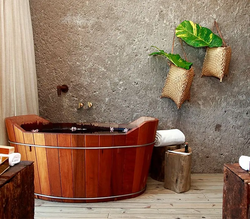 O Kenoa oferece várias opções de acomodação, incluindo suítes com vista para o mar e vilas privativas com piscina infinita, cada uma decorada com um estilo rústico-chique exclusivo.