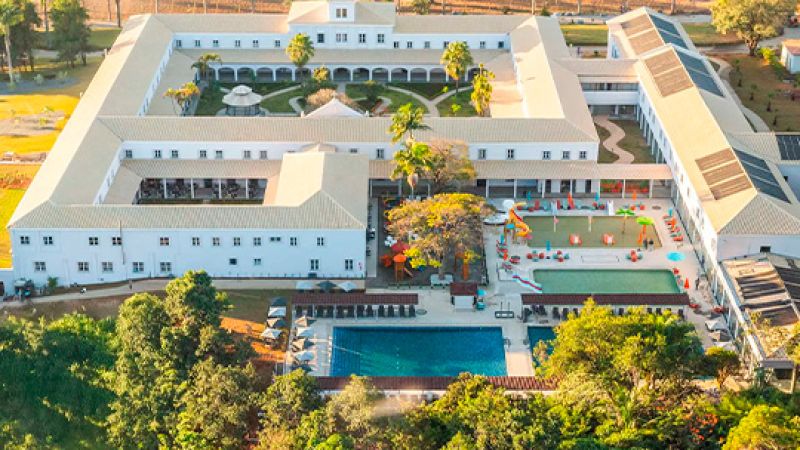 A estrutura de lazer inclui piscinas, spa, academia, áreas verdes, trilhas e espaços de relaxamento. A proposta do hotel é proporcionar bem-estar, descanso e contato com a história local.
